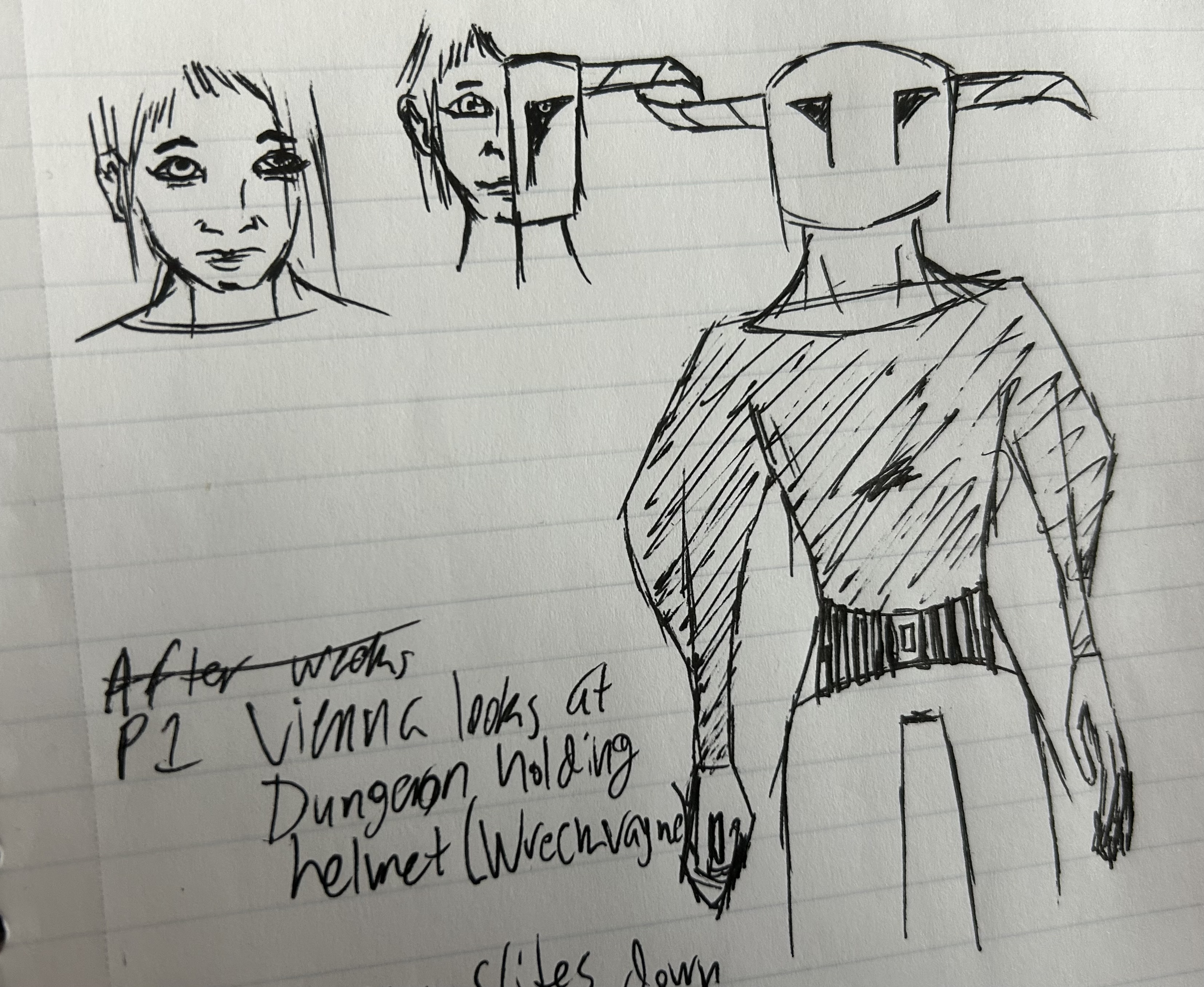 The helmet was dull steel with two small triangular eye ports with slits descending along the cheeks and brown insulating fabric. It was adorned on the right and left with two twisting ivory horns- one curving up and the other turning down. Vienna was immediately struck with confusion at the scene. All she could think was "What is this place?" The helmet was surrounded by sigils painted on the ground with a wide brush and heavy hand. She had never seen these symbols before- and has not seen them since. Laid open on the fountain edge between the single exit where Vienna stood and the pedestal holding the helmet was a small journal, yellowed with time and no more than ten pages in length. Cautiously, she approached and lifted the old book. Reading the first page, she learned this was Sant Dreylla's "face" gifted to a priest of the faith some hundreds of years before. Taken aback, she skimmed through the rest of the priest's words, learning that so long as the "face" was displayed, the village would be prosperous until the day Sant Dreylla returned and "rescued the flock". Vienna grew distant and put the journal into her bag, unable to take her eyes off the unreflective sheen of the helmet. As if someone else pulled her limbs, she crossed the fountain's threshold and creeped towards the helm until each hand cradled a horn and lifted the light piece over her head.