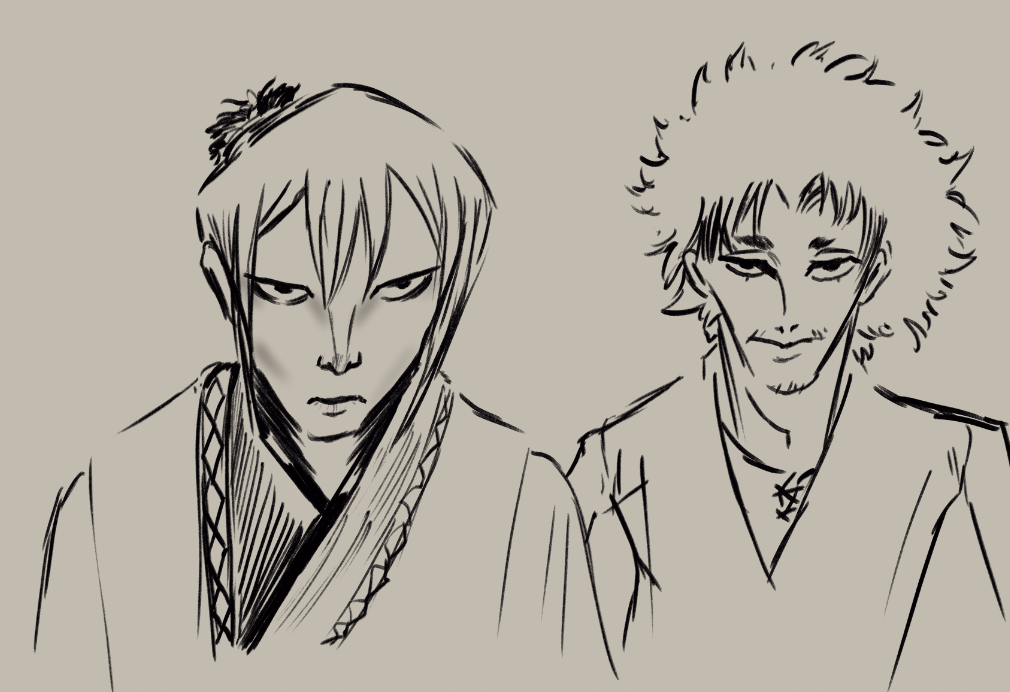 Since that day, Yuno swore he would not serve Godo and would never become samurai filth. He became a rebel in his teens and was often thrown down and out by those authoritarian samurai- he was trained but knew what it meant if he held a weapon against them. Still, in private he became a guard for hire, plainclothes and a wakizashi were his uniform. He handled petty fights between civilians and made enough money to support his mother. One day a note came to him, a letter of hire. He followed the instructions to find his employer that promised a suspiciously large sum of zenit, and was deceived. It was a samurai investigation. Being a sword-for-hire was illegal under Godo’s rule. They beat him near death but could not kill him because Yuno refused to draw his blade- so they staged his death. They threw him over a bridge into a river. When he awoke, a samurai of great stature stood over him.