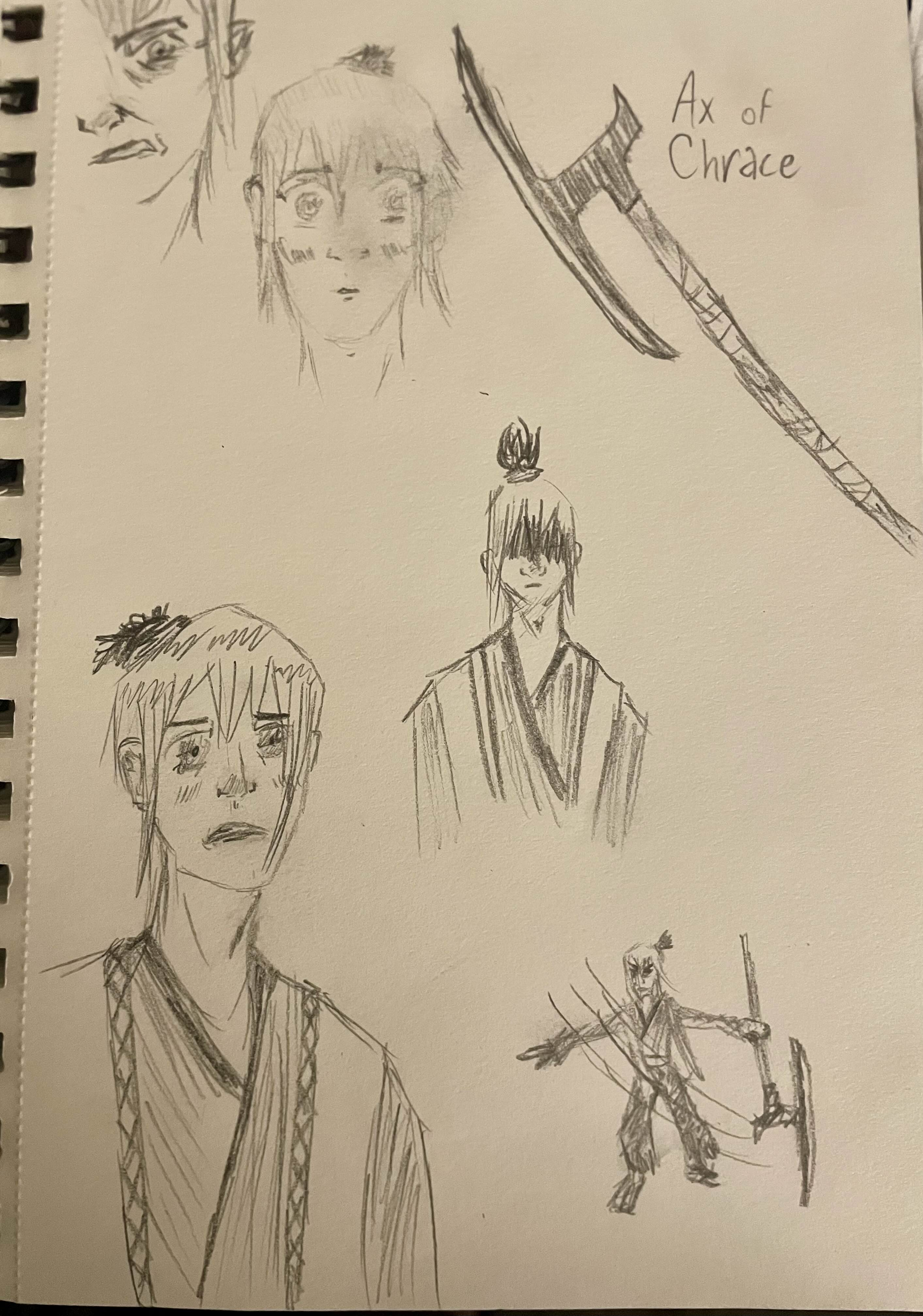 Yuno was born into a samurai-soldier family. Three generations before him have served in Godo’s imperial army, achieving a high status and a known family name. As a child, Yuno trained constantly, looking forward to honoring this name- until his father came home abruptly. It was winter, and the ash was settling in his home village of Moetsukiru. The ricepaper wall nearly caved in as his father stumbled through his home. Behind his father were two samurai. He heard his mother ask what was going on, and her husband laid his hands on her and told her it was her fault. The samurai pulled him off of her and threw him to the ground, asking where his armor was. He meekly showed them, and they took it. He gambled away his honor. In some sort of twisted sense of justice, the man took his katana and pointed at the samurai, unable to keep steady. The men in their red plates laughed at this feeble, insignificant man and told him that was a legal death sentence and cut him down where he stood. They took his sword, as well as his armor, and left without a word.